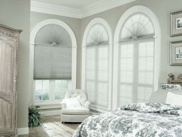 Их ткань представляет собой плиссированный полиэстер с разнообразием расцветок и фактур, которая складывается гармошкой. Замечательны своей эстетикой и современным уровнем комфорта. Идеально подходят для окон со сложной геометрией: арочных, треугольных, круглых - которые можно закрыть от посторонних глаз и солнечных лучей только гофрированным полотном.